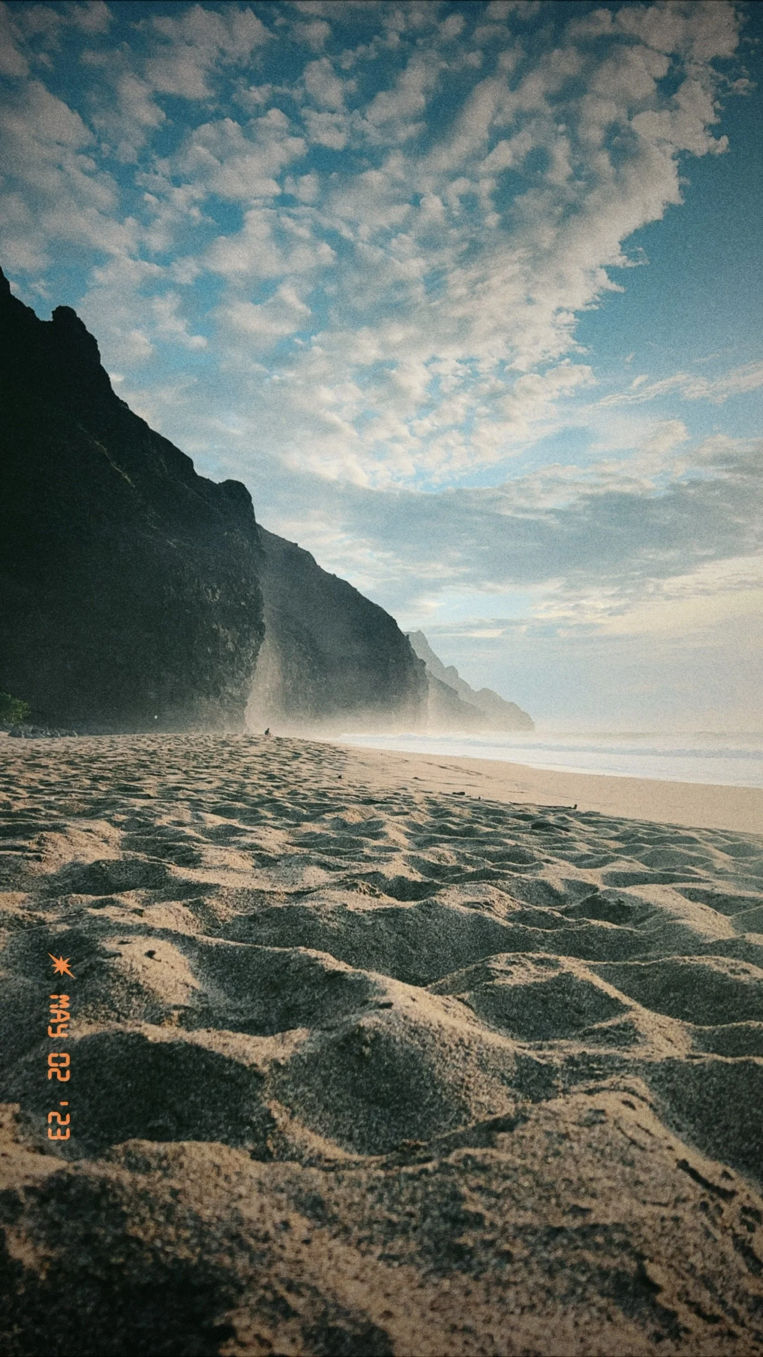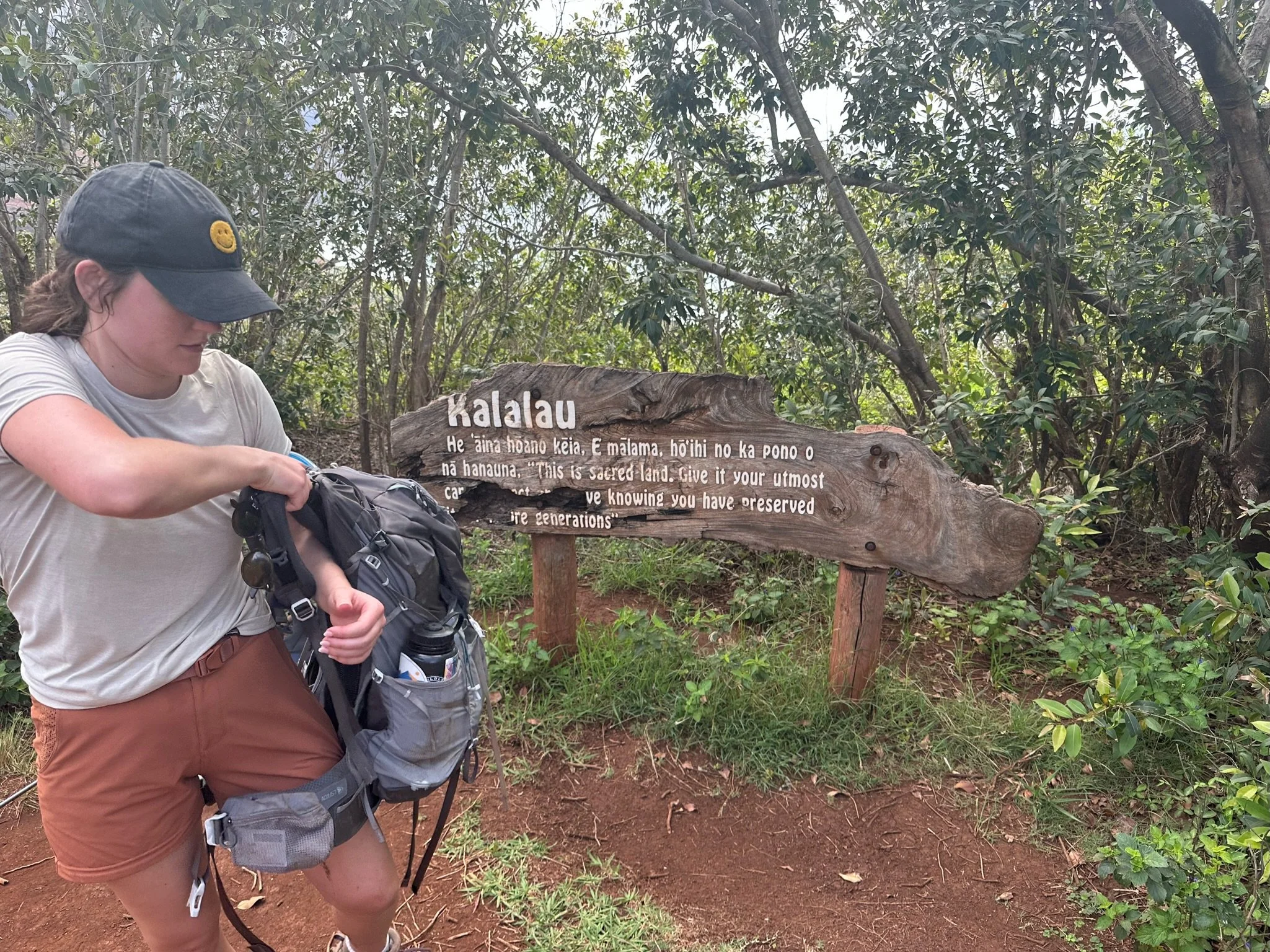 We hit the Kalalau sacred land sign which means one more mile to the beach. We pause for a moment to take a few pictures and get excited to finally be on the beach. It’s been a sweaty, sunny, hot, and long day we’re ready for a refreshing dip in the ocean and to put these packs down.
